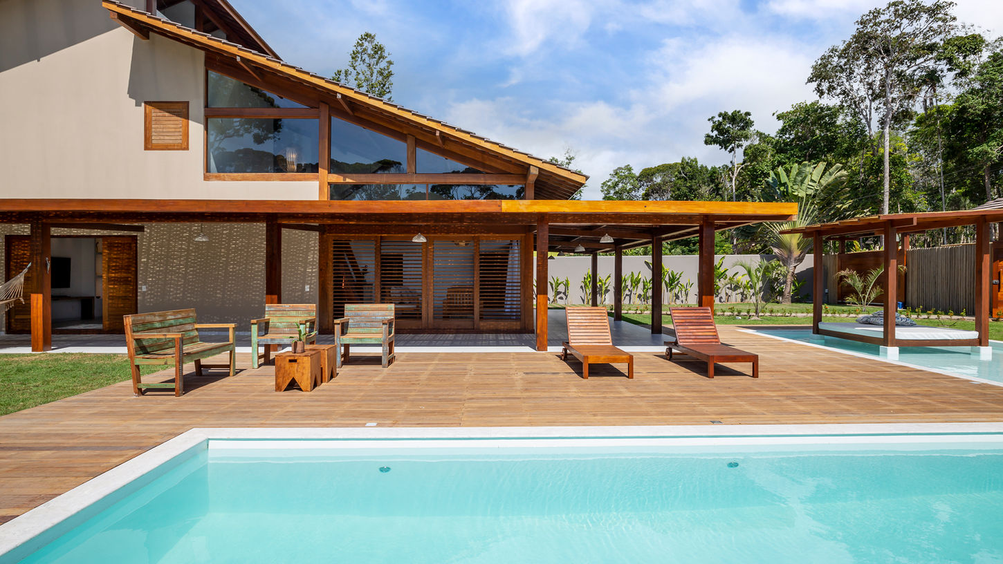 A área de lazer completa tem varanda coberta com redes, piscina, área de churrasco com cervejeira e jardim.